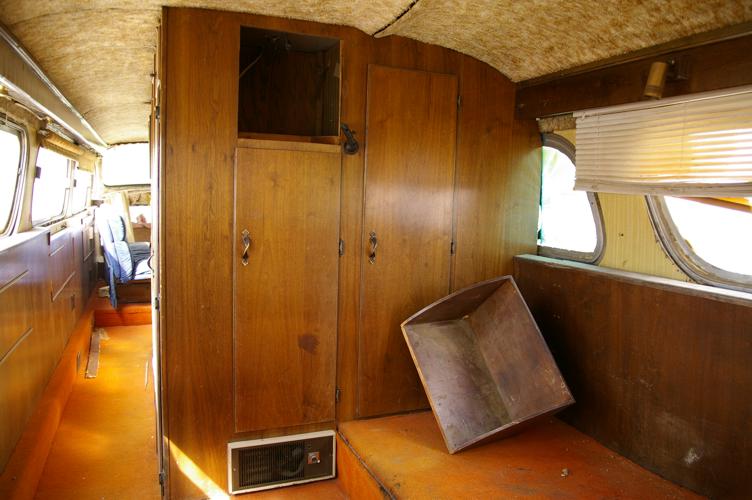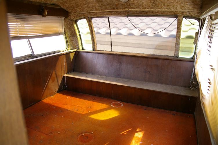 Back Bedroom areaThis is the rear bedroom. It's just as ugly as the rest of the bus, but because it doesn't have to do much, it is also one of the lower-priority areas. For now, a good futon matress and it's useable. Still, I might let my wife strip it out soon. I know there is a rotted bit of flooring above the right rear corner of the engine compartment that needs to be repaired. |